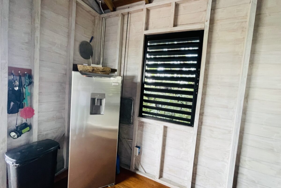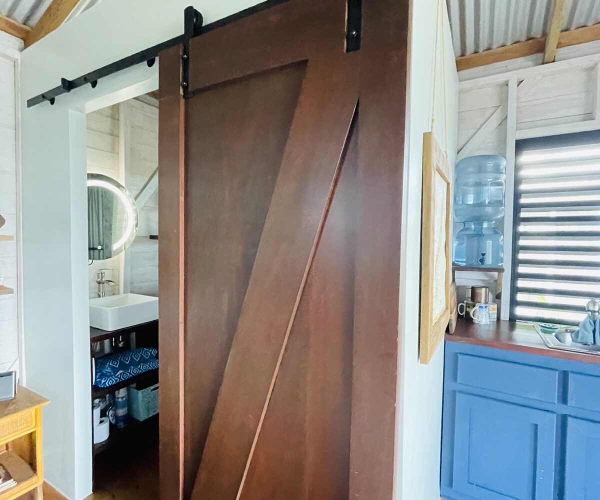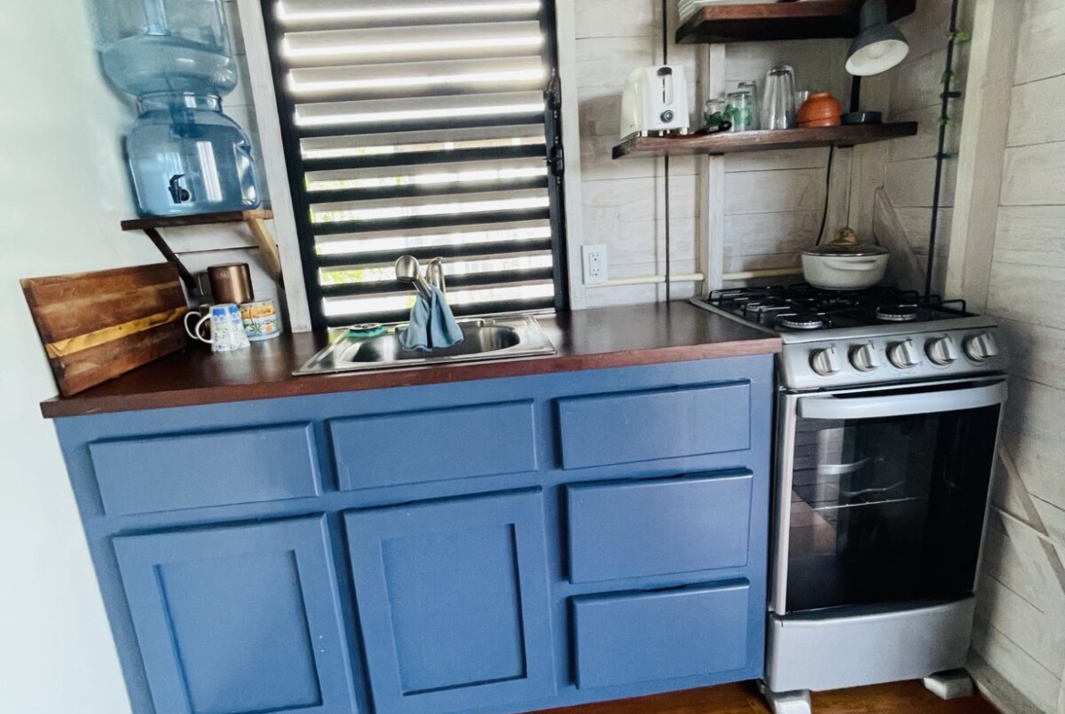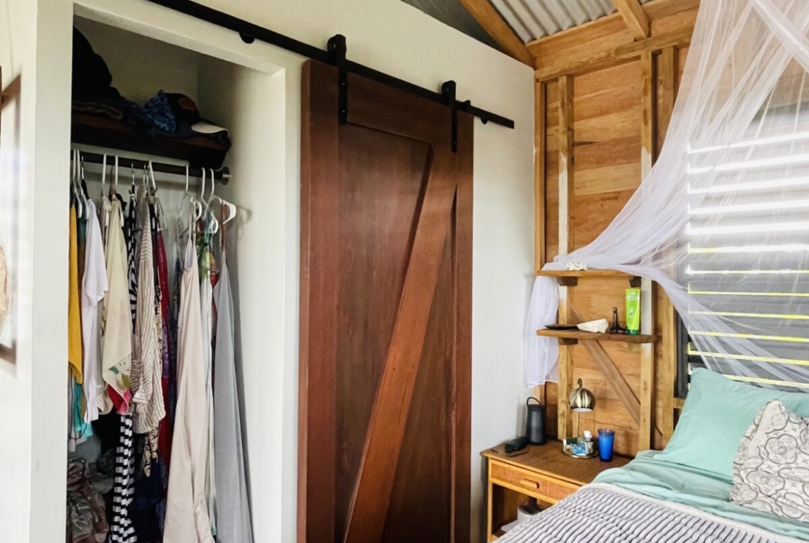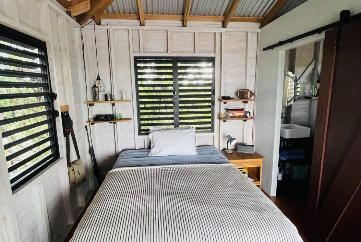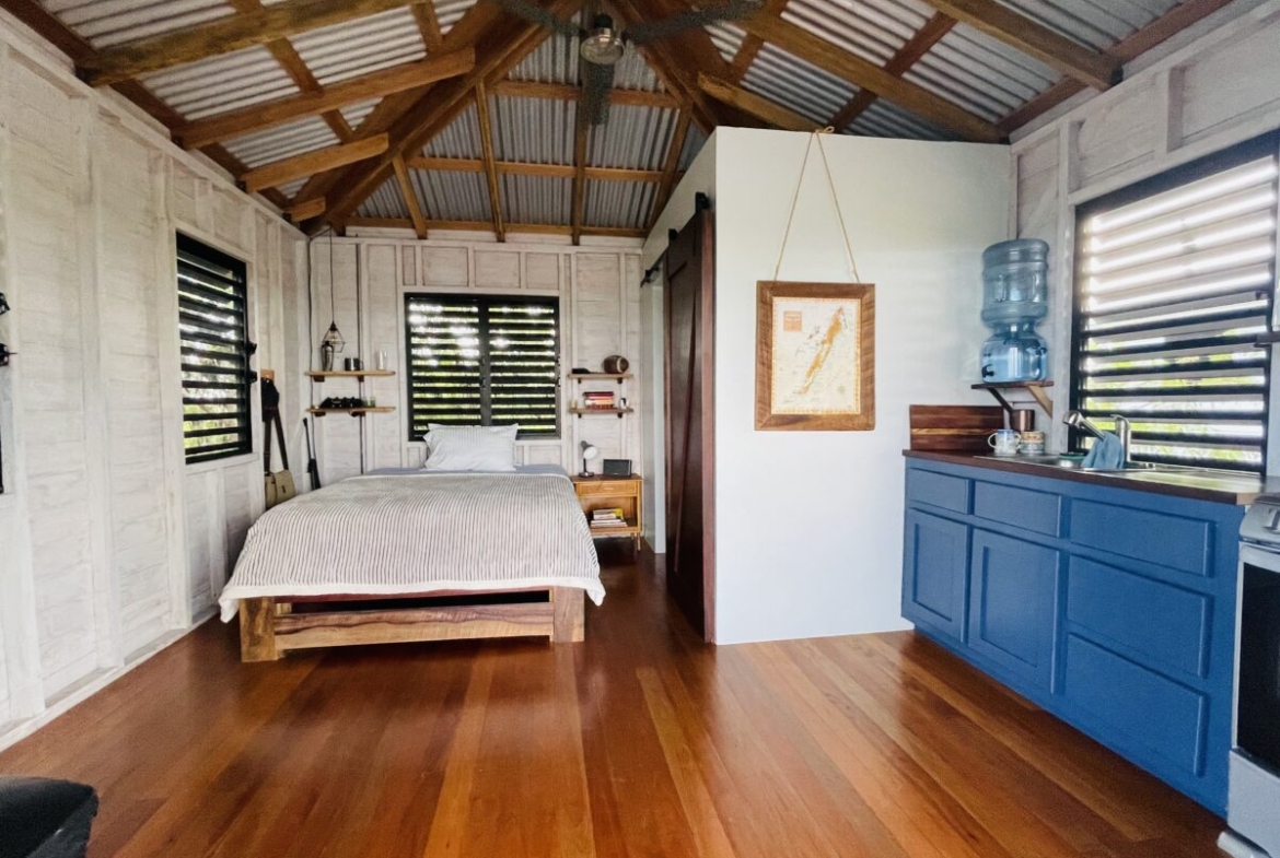 The casitas are little tiny homes constructed with a hip roof which allows for water collection from all 4 sides of the roof. The seller has designed larger 2 foot eaves on all 4 sides for better rain protection and collection. The windows of the units are not glass, but are hurricane proof locking louvers and screens. The homes include a complete 3 piece bathroom, full kitchenette, and a bedroom area with separate closet. 2 Beautiful mahogany barn doors open up onto the 8 foot deep veranda area with removable screens used for dining and relaxing.