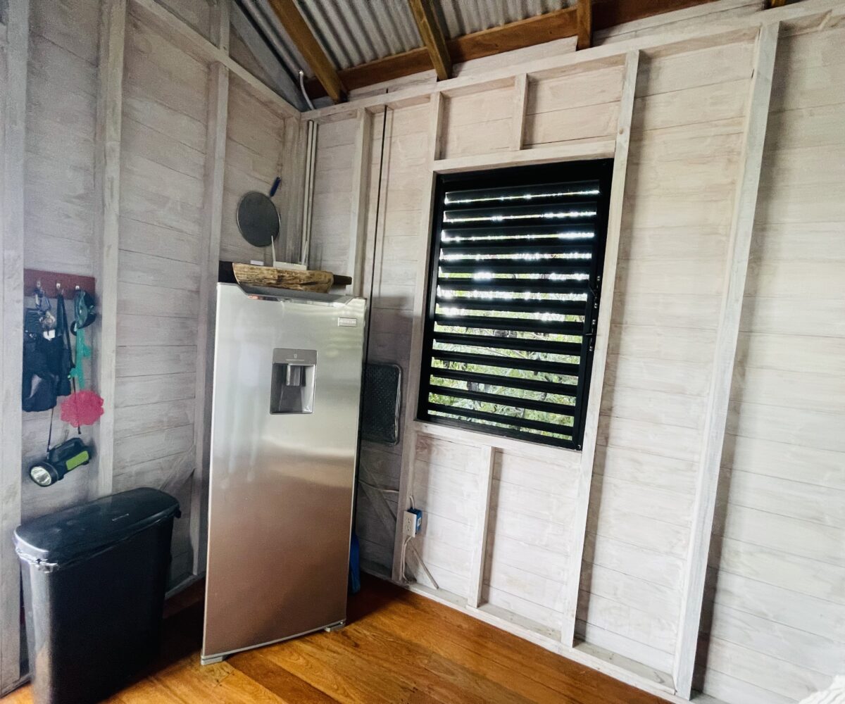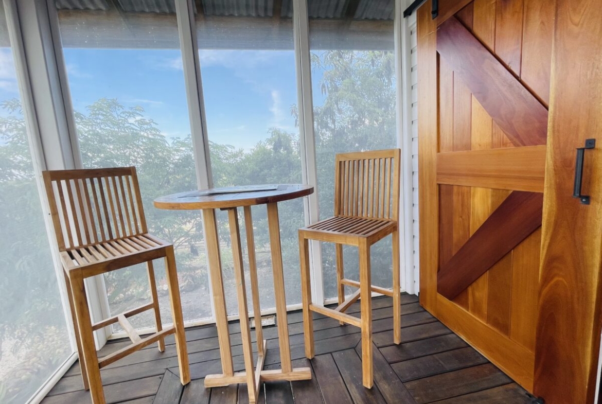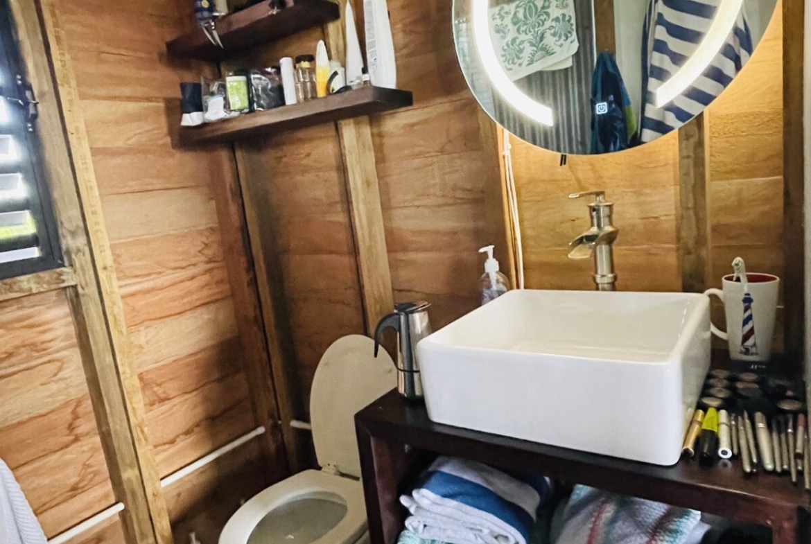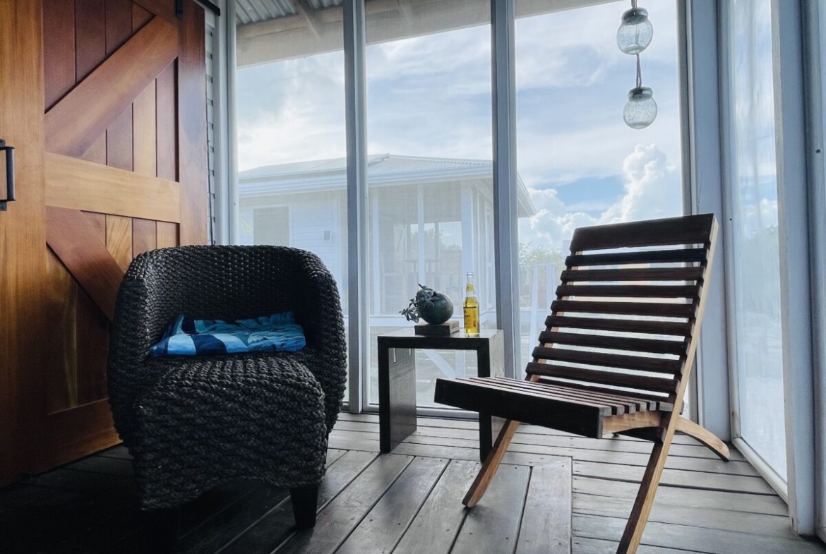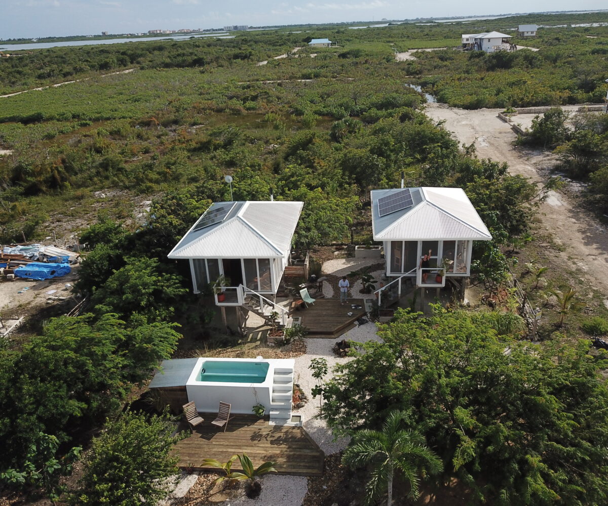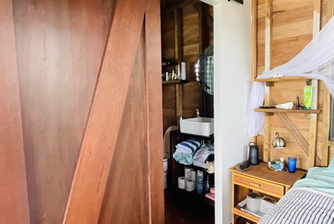 The casitas are little tiny homes constructed with a hip roof which allows for water collection from all 4 sides of the roof. The seller has designed larger 2 foot eaves on all 4 sides for better rain protection and collection. The windows of the units are not glass, but are hurricane proof locking louvers and screens. The homes include a complete 3 piece bathroom, full kitchenette, and a bedroom area with separate closet. 2 Beautiful mahogany barn doors open up onto the 8 foot deep veranda area with removable screens used for dining and relaxing.