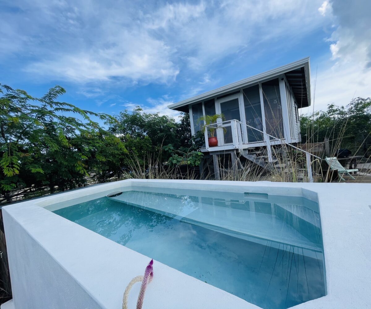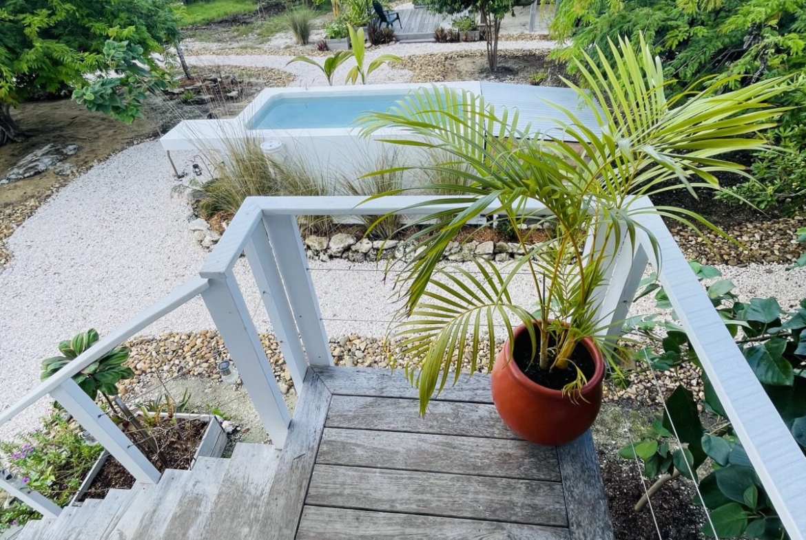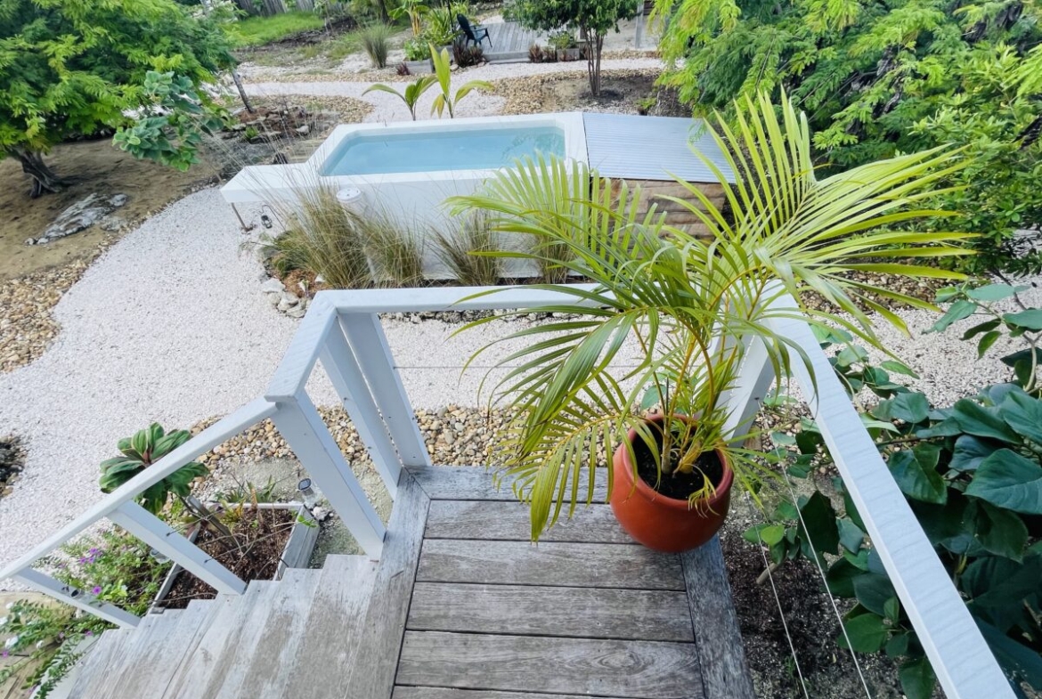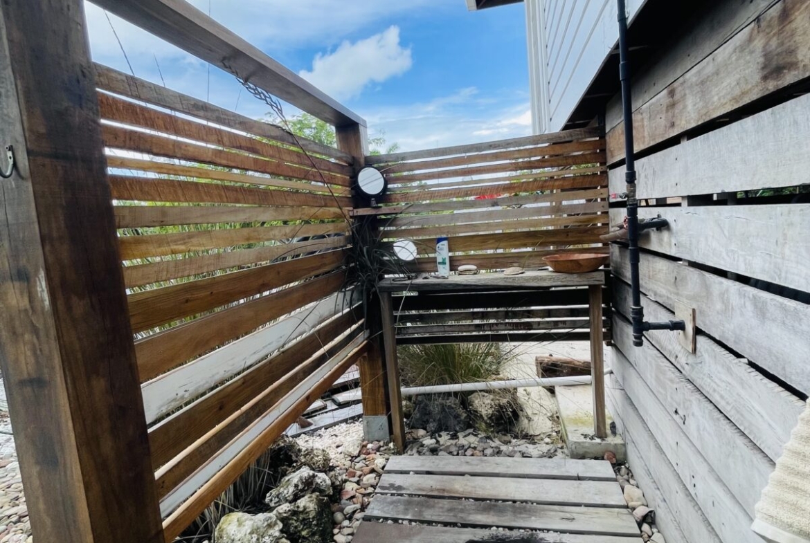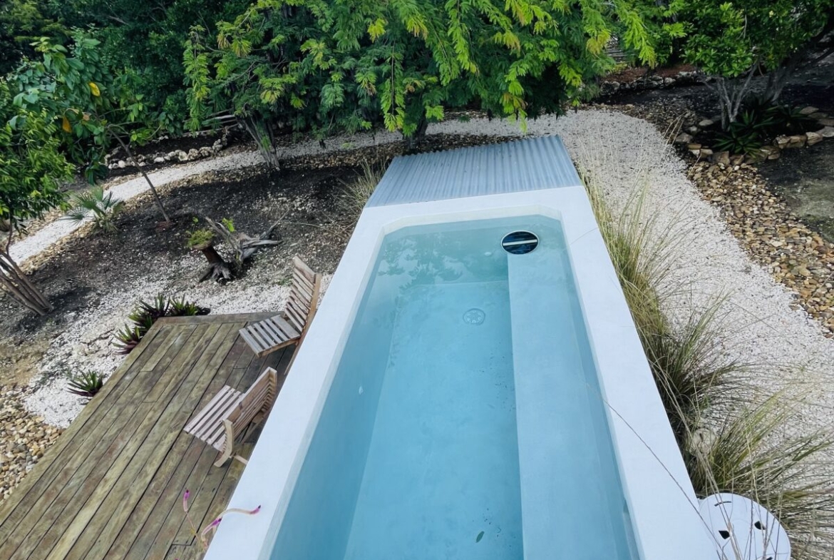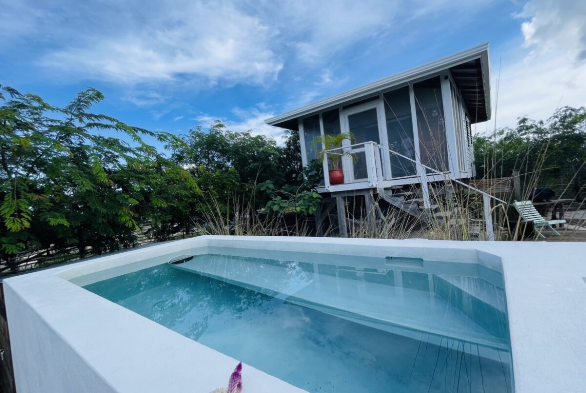The overall property includes but is not limited to: a concrete above ground 6 ft. x 10 ft. plunge pool. The pool lighting and pumping system are solar powered, and run off the main system. The property has 2 belizean hardwood decks, a screened in outdoor shower, a 6 foot x 10 foot windowed storage building in the back of the property, as well as an outdoor woodworking area.