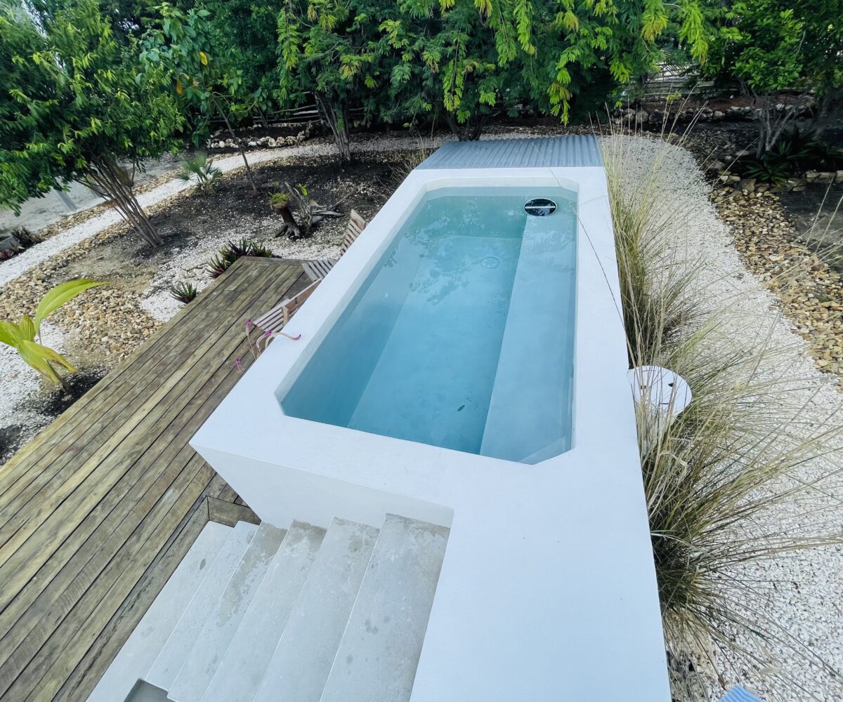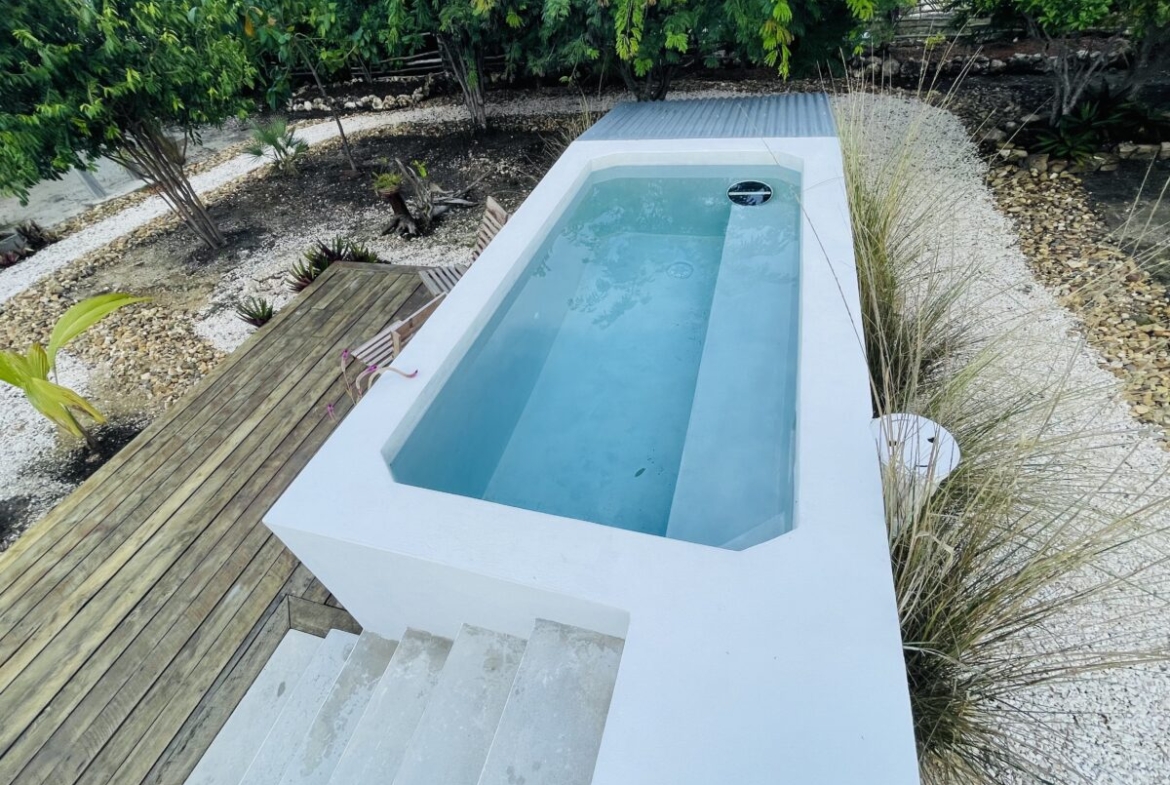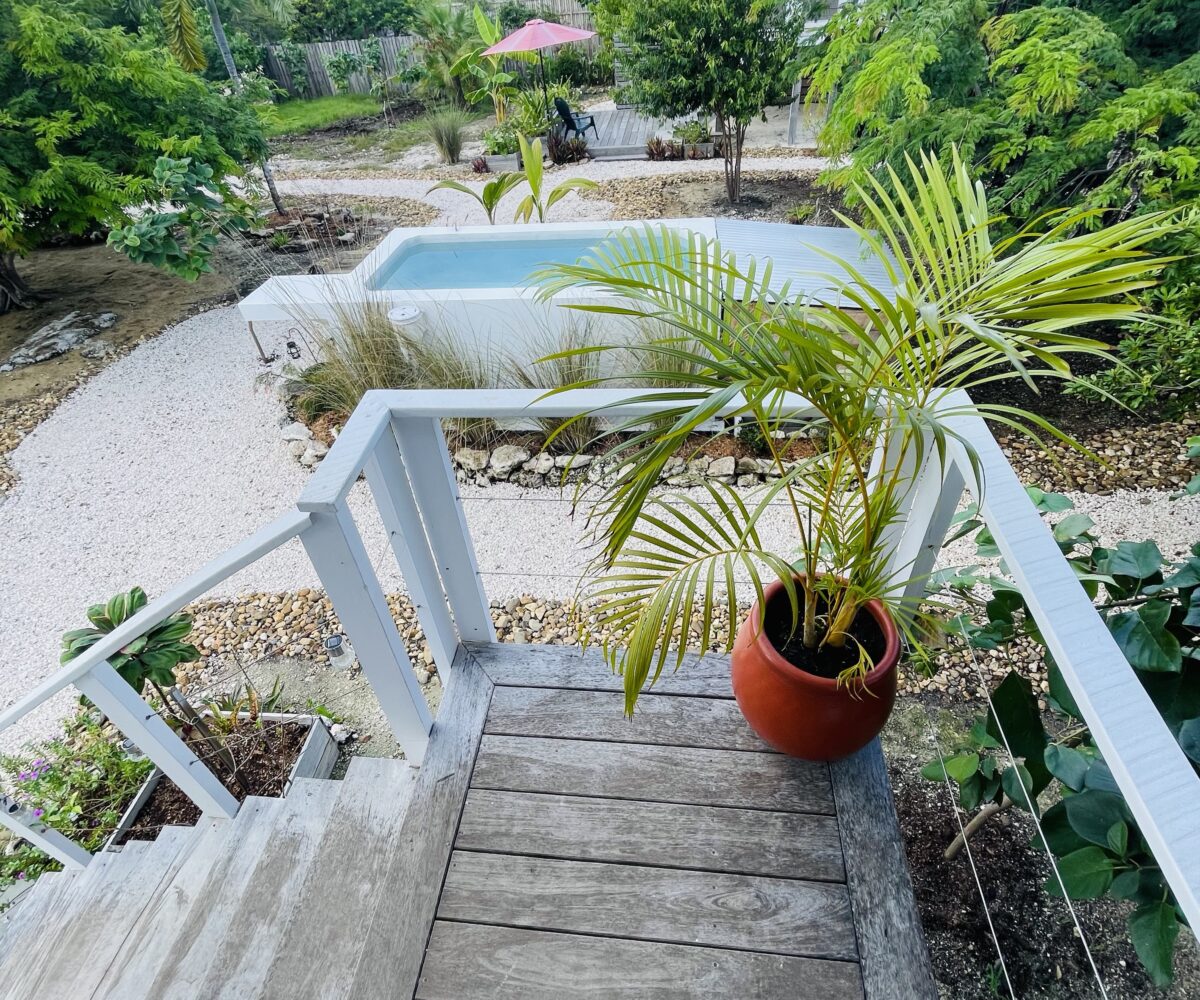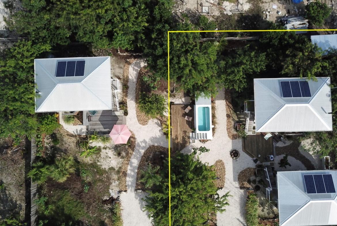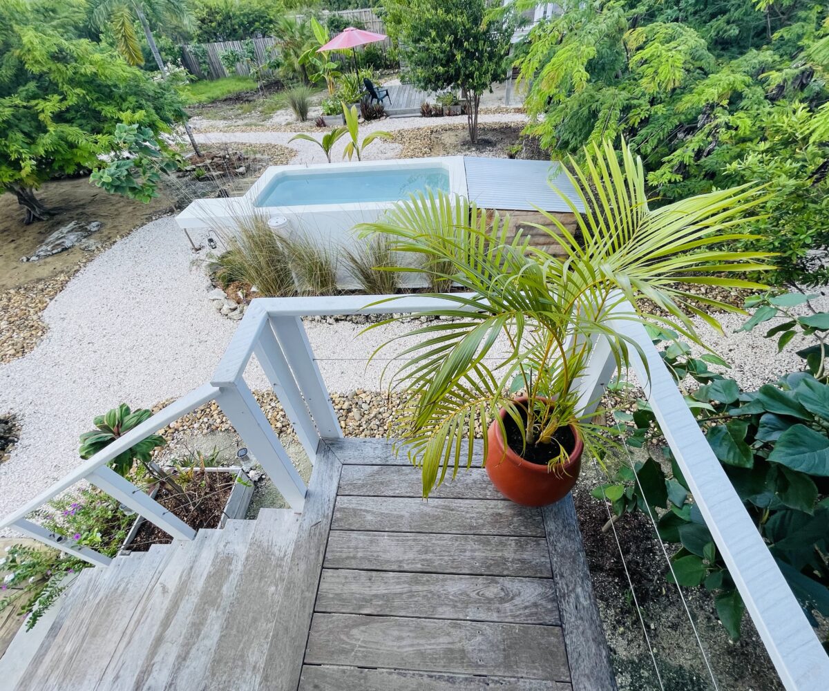 The overall property includes but is not limited to: a concrete above ground 6 ft. x 10 ft. plunge pool. The pool lighting and pumping system are solar powered, and run off the main system. The property has 2 belizean hardwood decks, a screened in outdoor shower, a 6 foot x 10 foot windowed storage building in the back of the property, as well as an outdoor woodworking area.