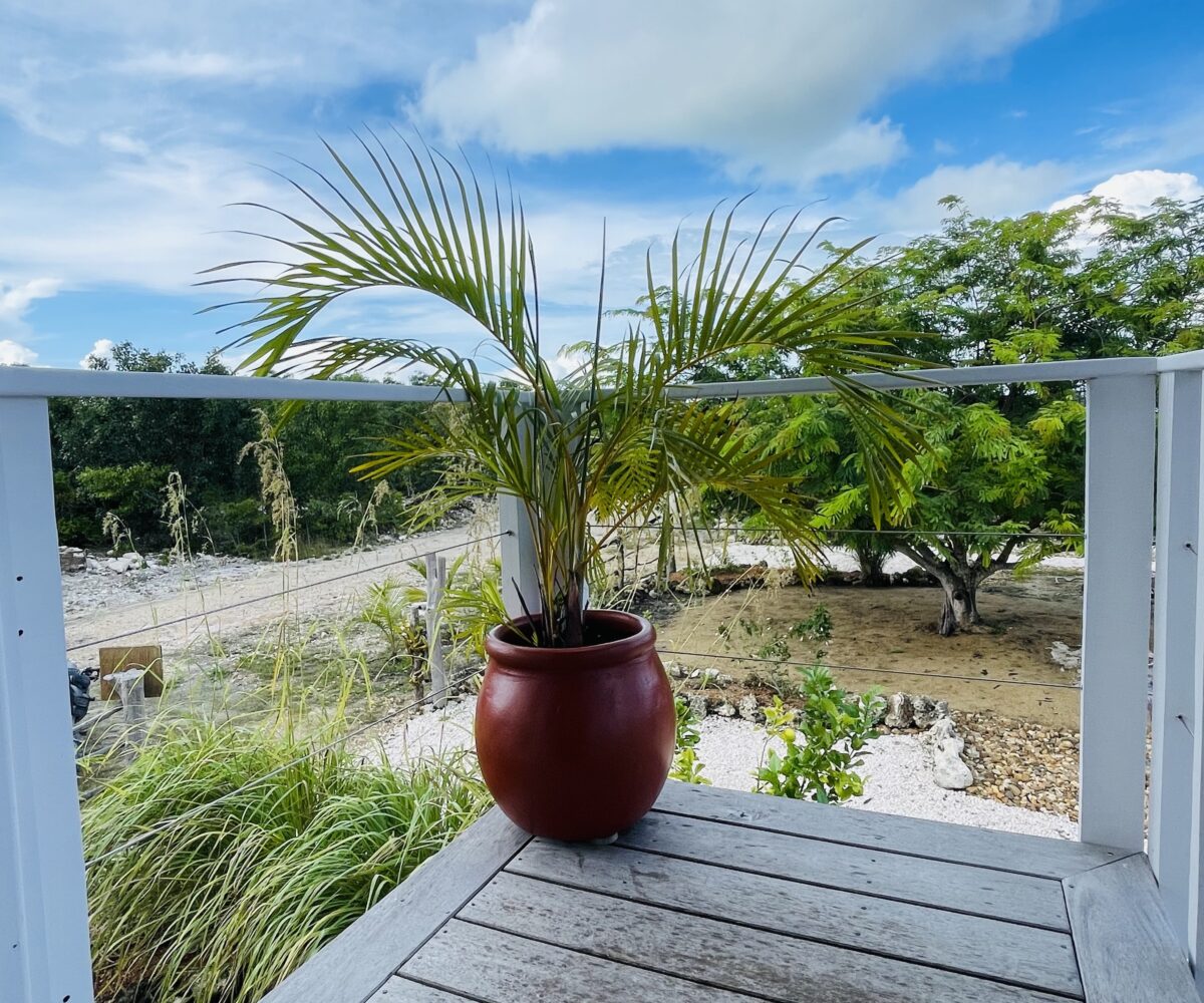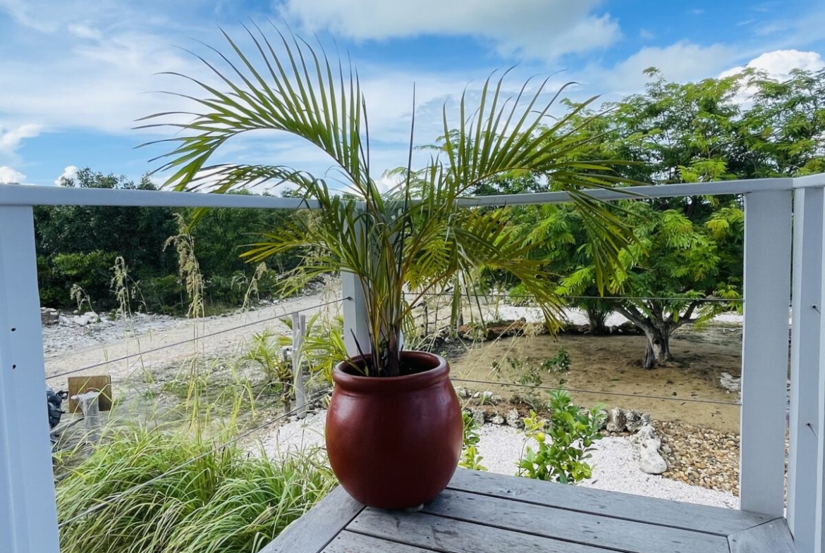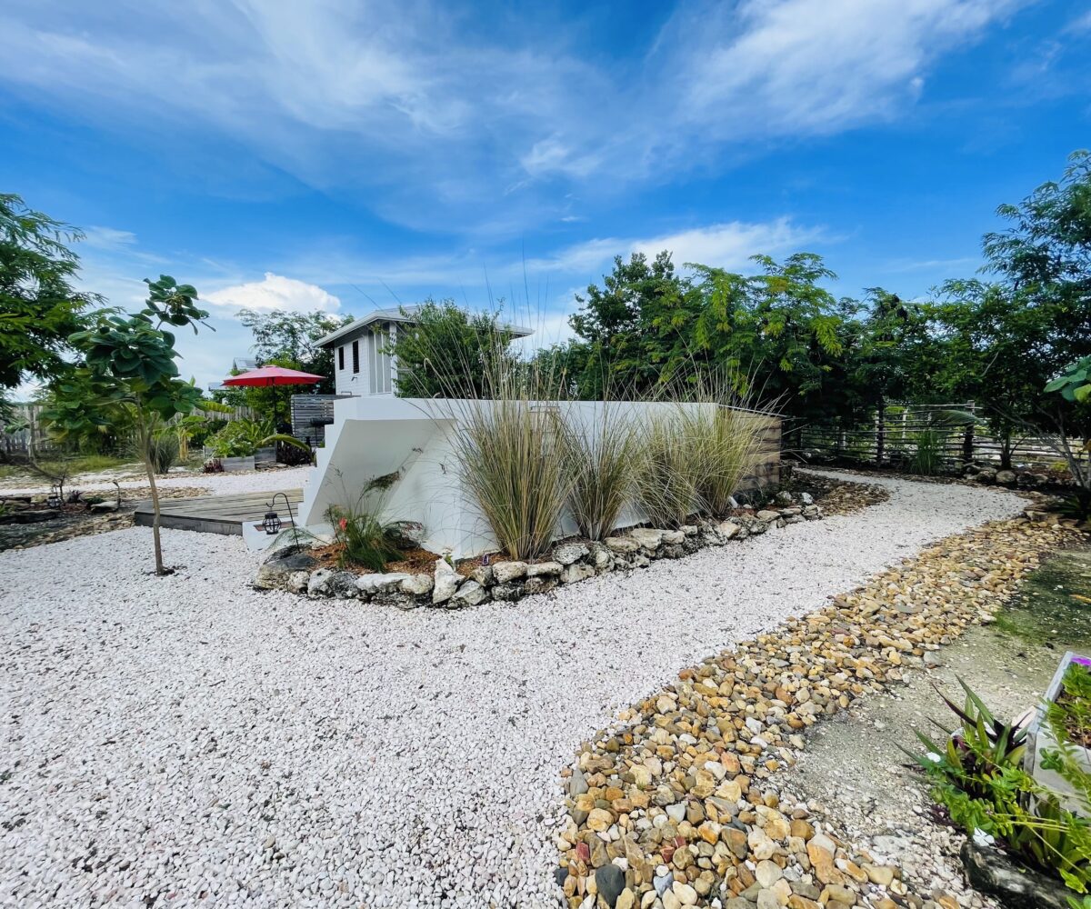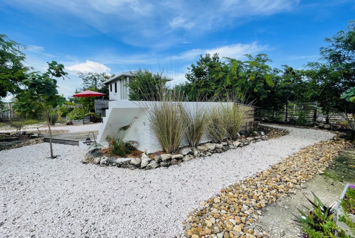The property is 60 feet by 75 feet in size, (418 sq. meters), is fenced and beautifully landscaped with both mature and planted trees; various palm, bamboo, zericota, banana, fern, as well as plants and flowers from around Belize. The same landscaping crosses over into lot 7980 to the North, creating a quiet compound feeling, especially at night with the tree lighting throughout the property.