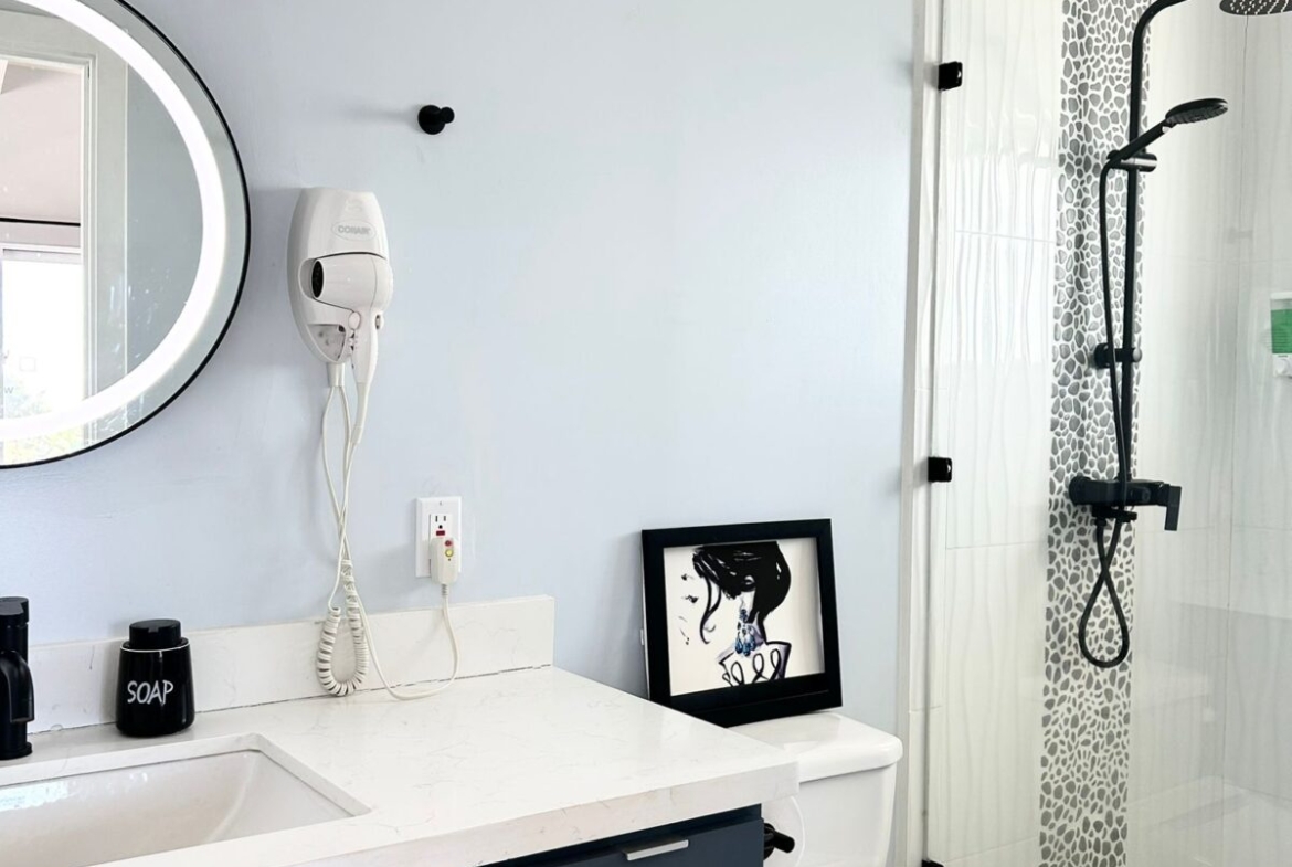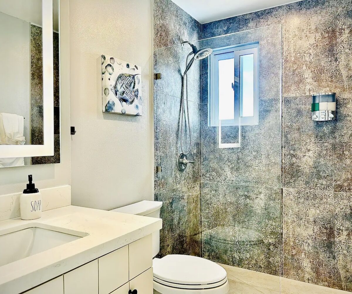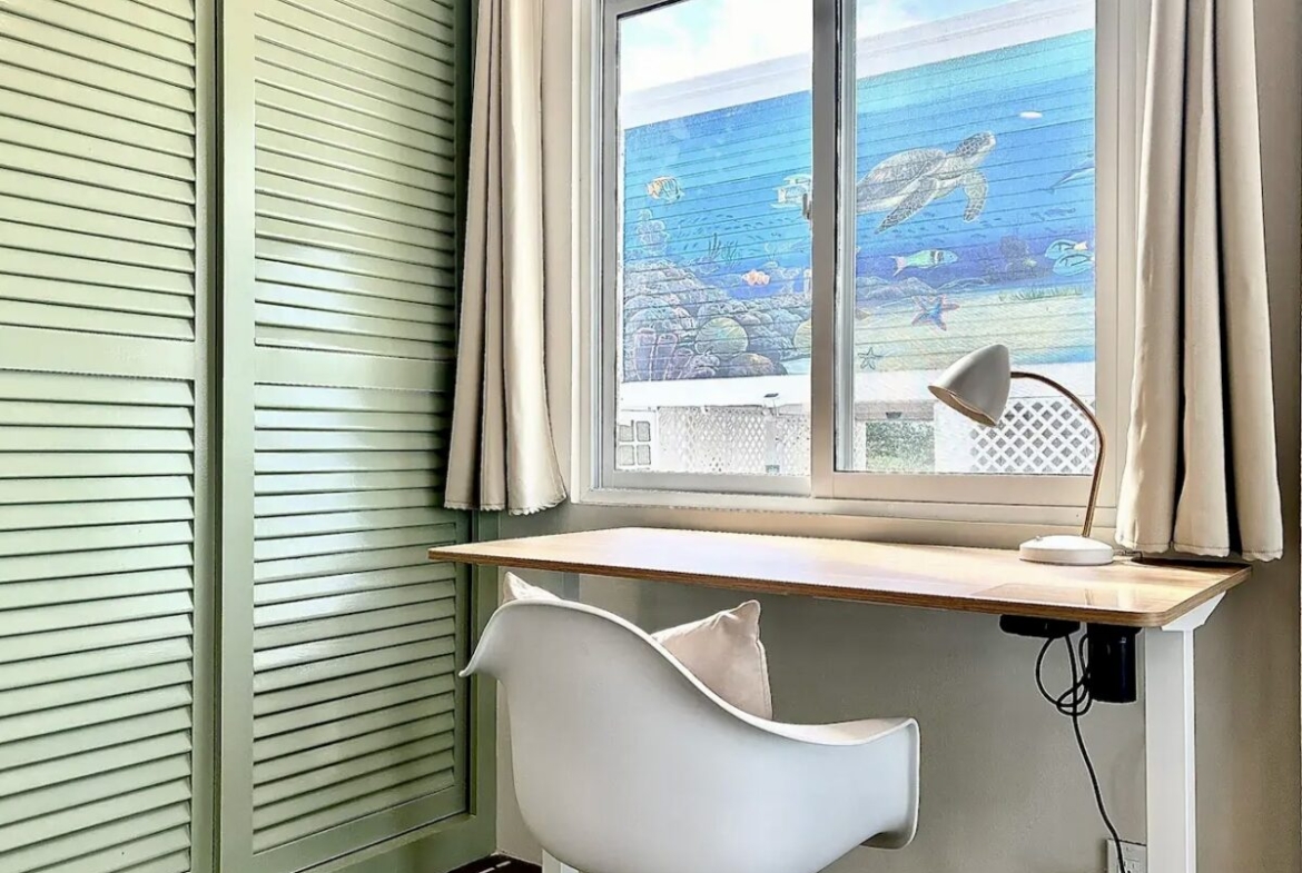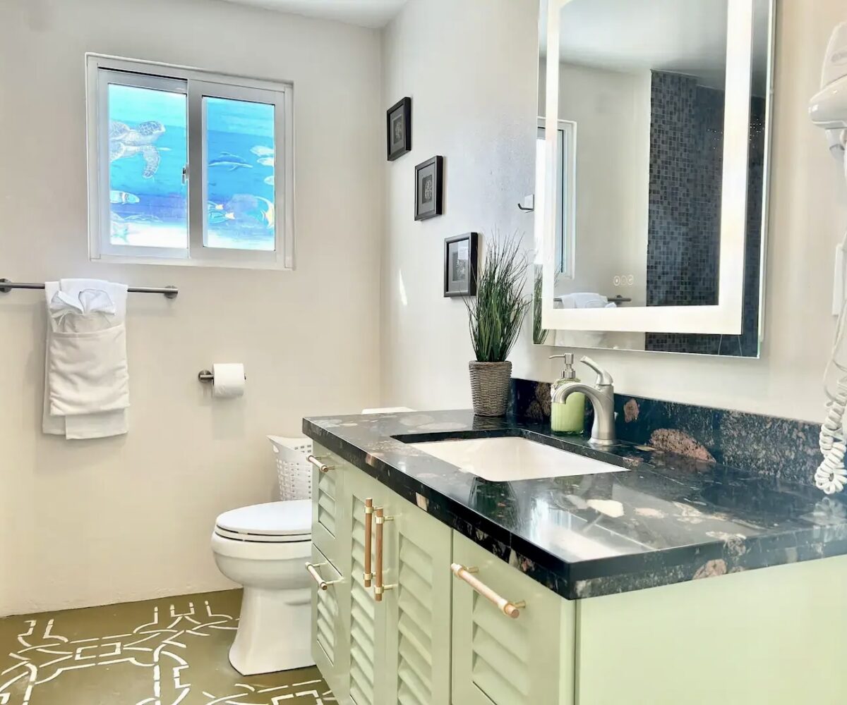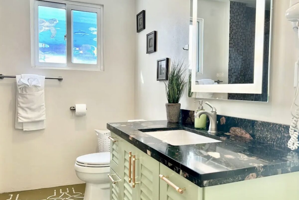 Downstairs, you’ll find a cozy 1-bedroom, 1-bathroom suite that spans 550 square feet (51 m²), complete with direct access to the shimmering pool and stunning views of the secret beach waters. This space is perfect for guests seeking tranquility while enjoying all that nature has to offer.