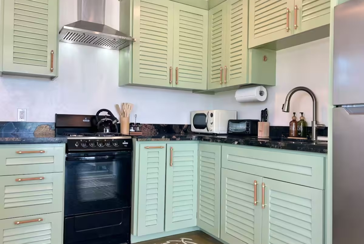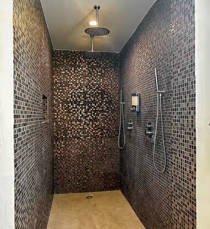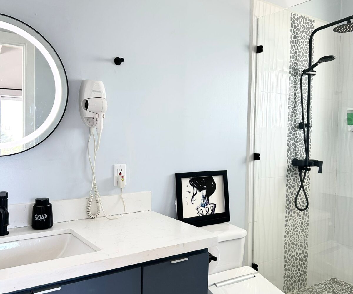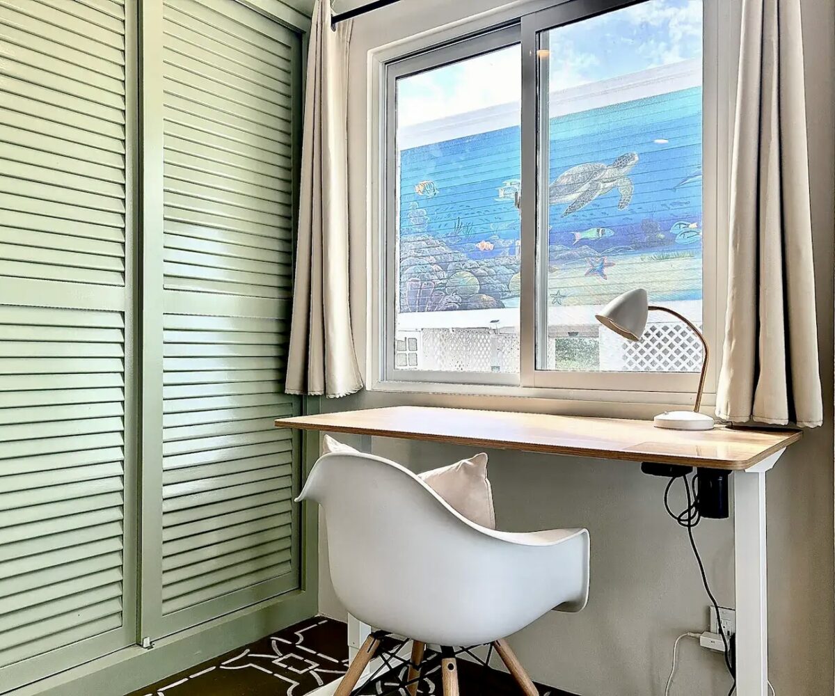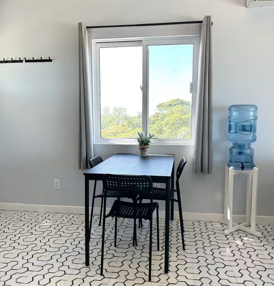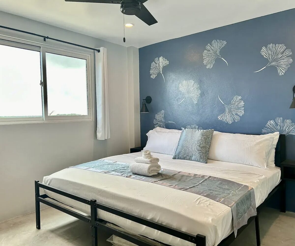 Downstairs, you’ll find a cozy 1-bedroom, 1-bathroom suite that spans 550 square feet (51 m²), complete with direct access to the shimmering pool and stunning views of the secret beach waters. This space is perfect for guests seeking tranquility while enjoying all that nature has to offer.