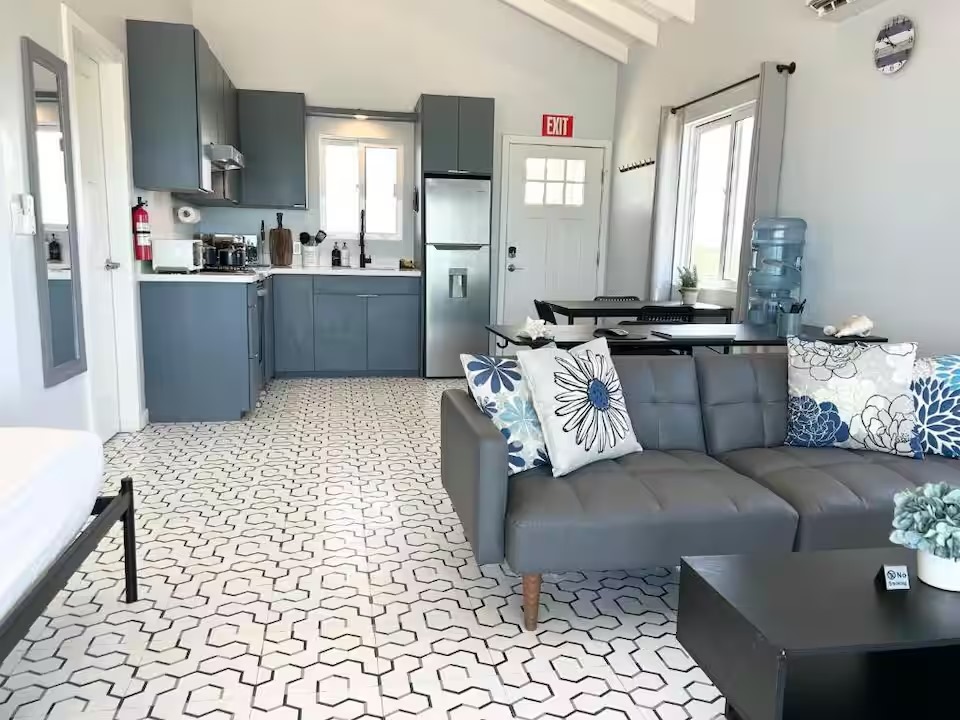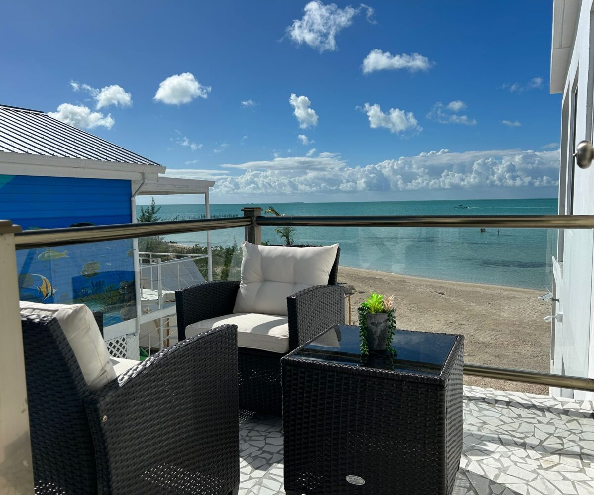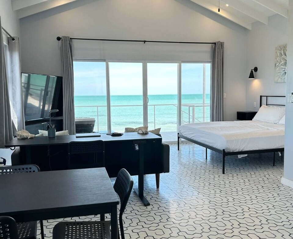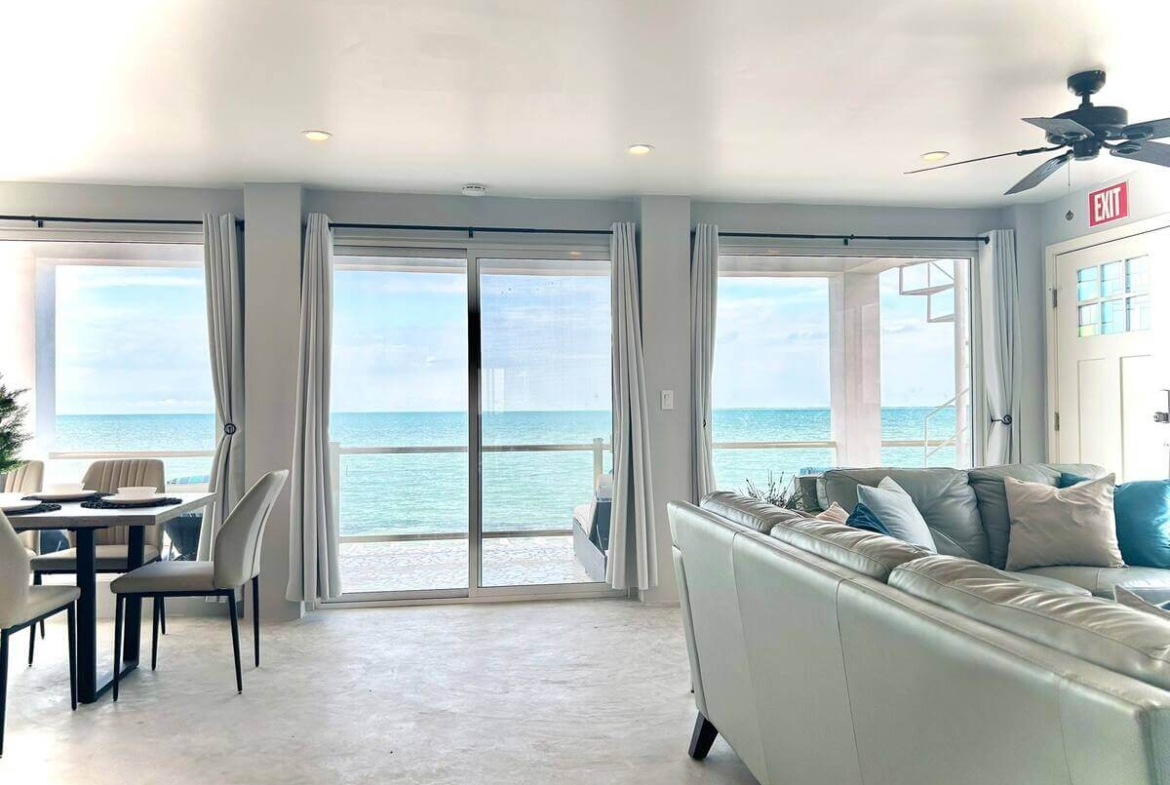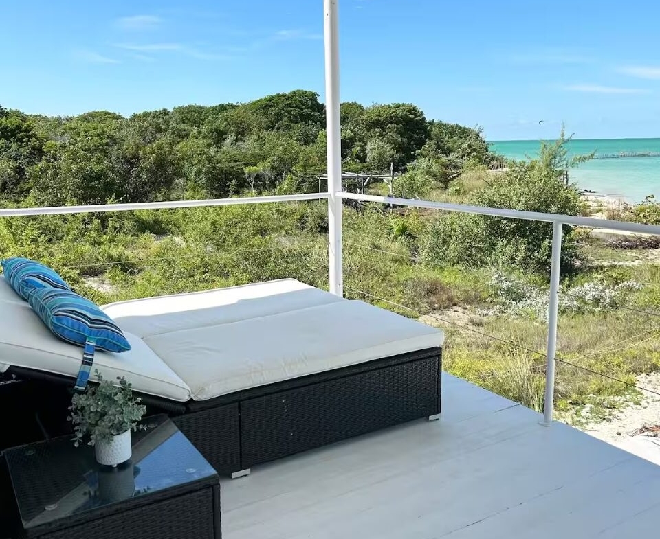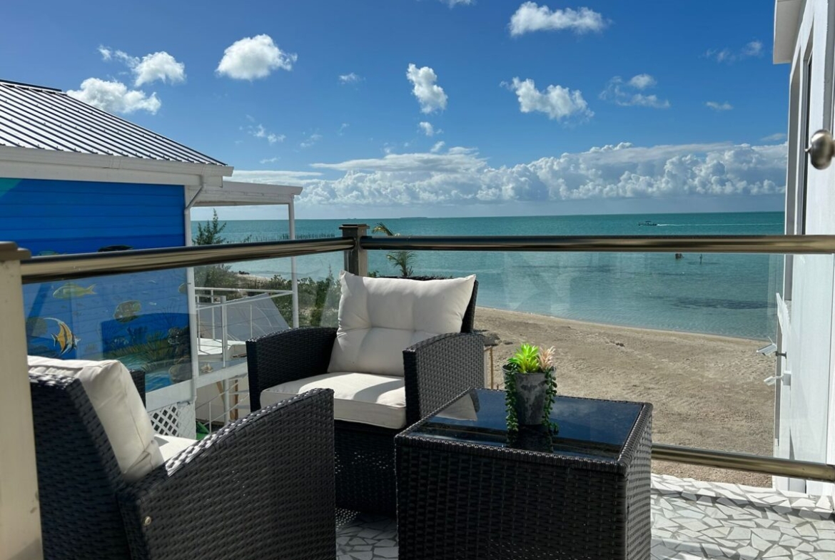 The main home features a spacious layout with 3 beautifully appointed bedrooms and 2 bathrooms upstairs, offering 1,000 square feet (93 m²) of modern living space. The open-concept design seamlessly integrates the kitchen and living areas, creating an inviting atmosphere perfect for entertaining or unwinding after a day at the beach. Enjoy breathtaking sea views from your private balcony—ideal for sipping morning coffee or watching the sunset over the horizon.